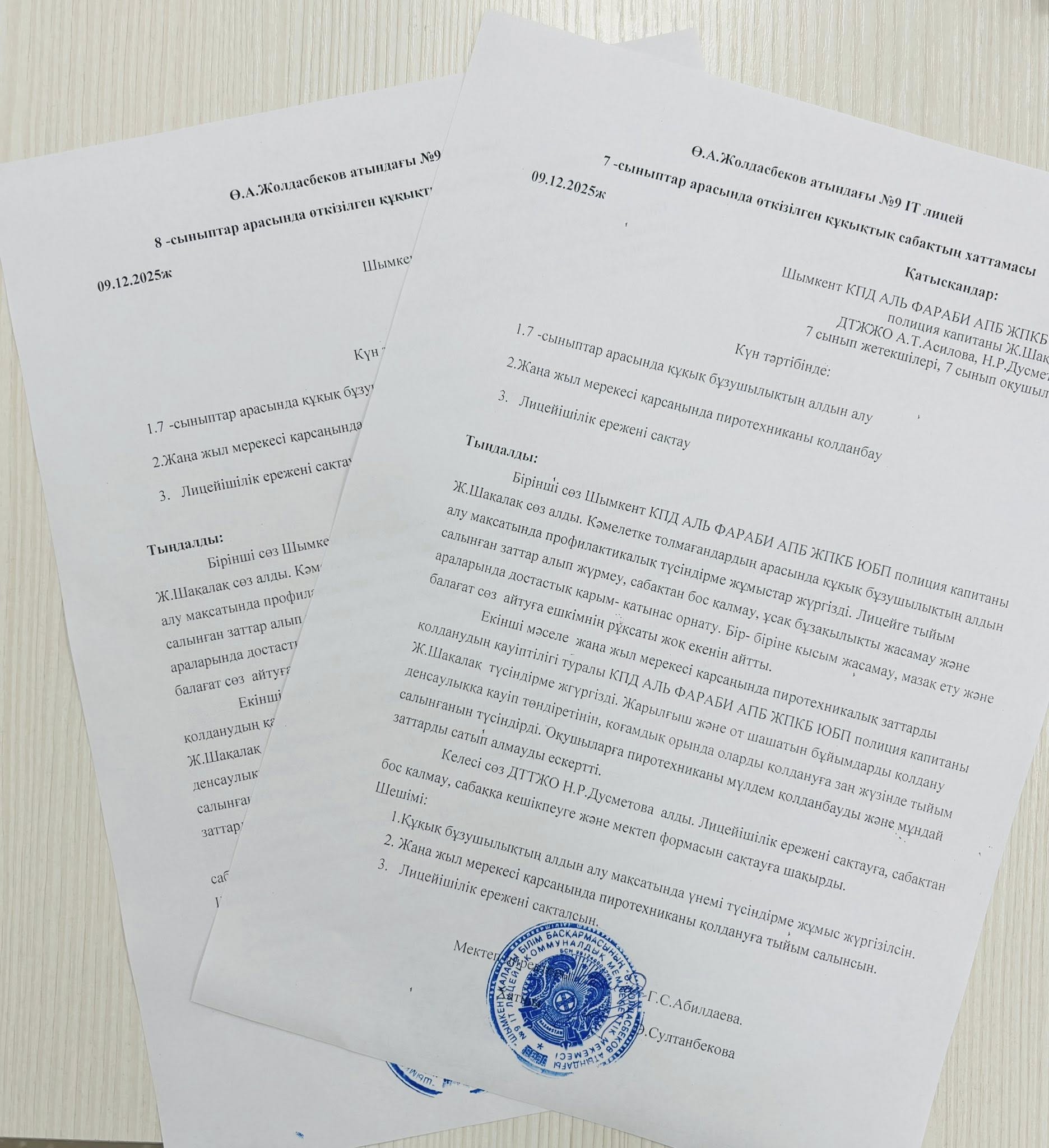 Іс-шараға лицей инспекторы Ж. Шахалақ, ДТІЖО Н. Р. Дусметова және А. Т. Асилова қатысып, оқушыларға пиротехникалық заттарды қолданудың қауіптілігі туралы жан-жақты ақпарат берді.