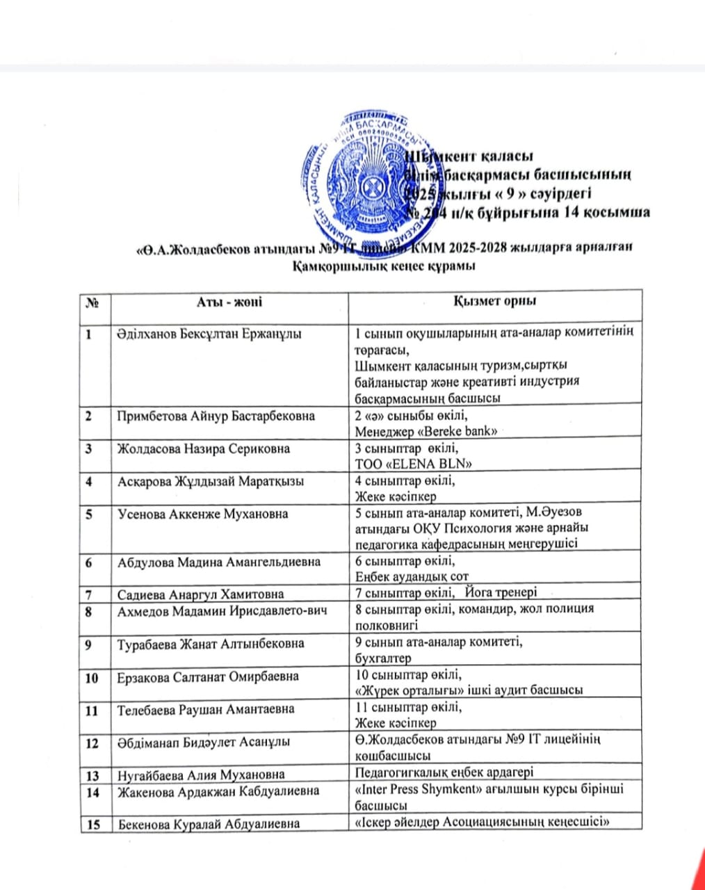 ҚАМҚОРШЫЛЫҚ КЕҢЕСТІҢ ЖАҢА ҚҰРАМЫ » «Ө.Жолдасбеков атындағы №9 IT лицейі»