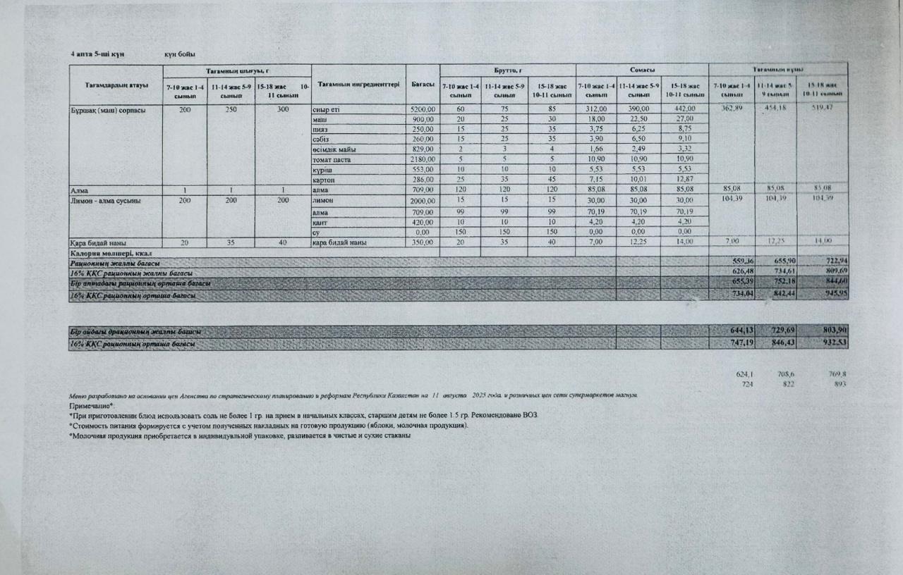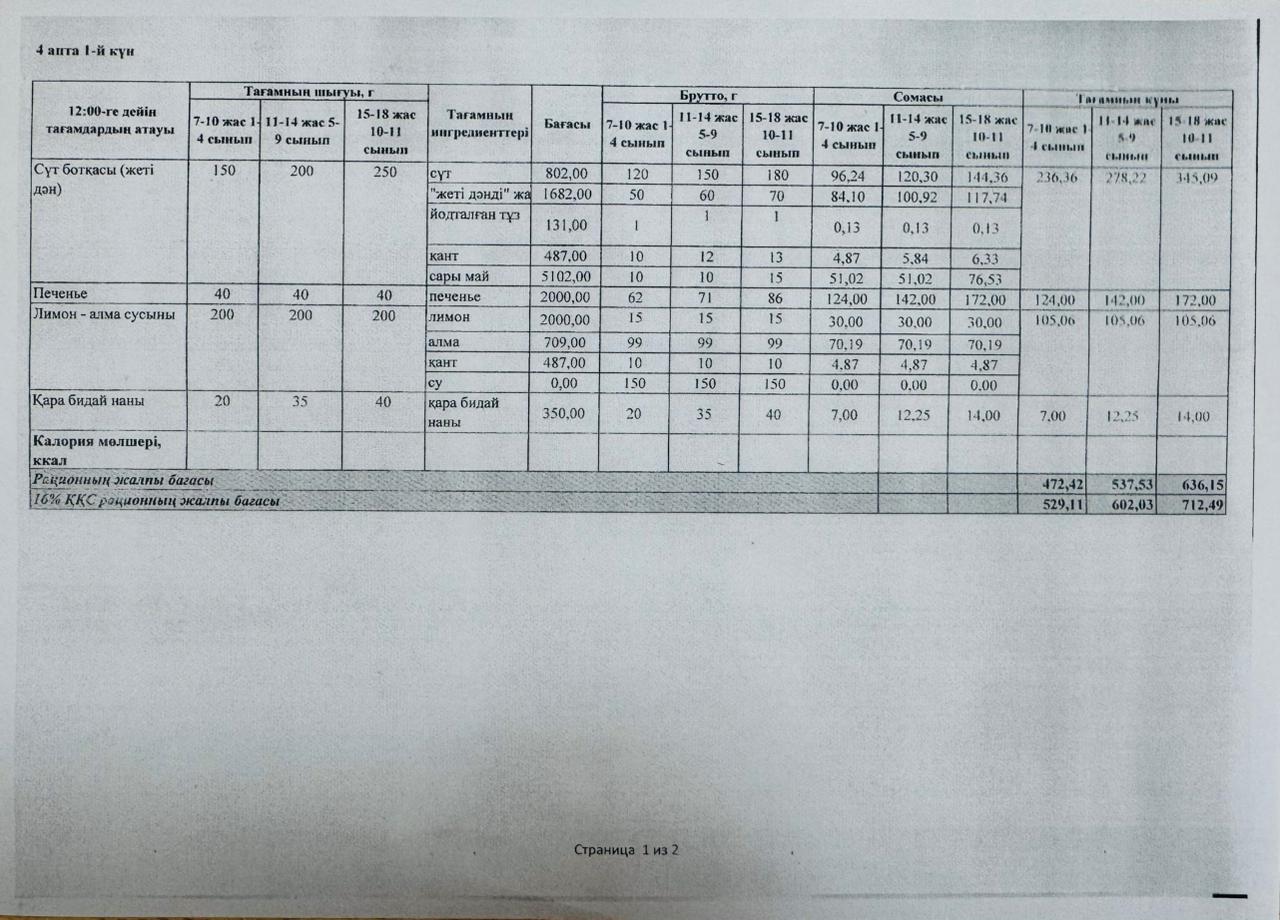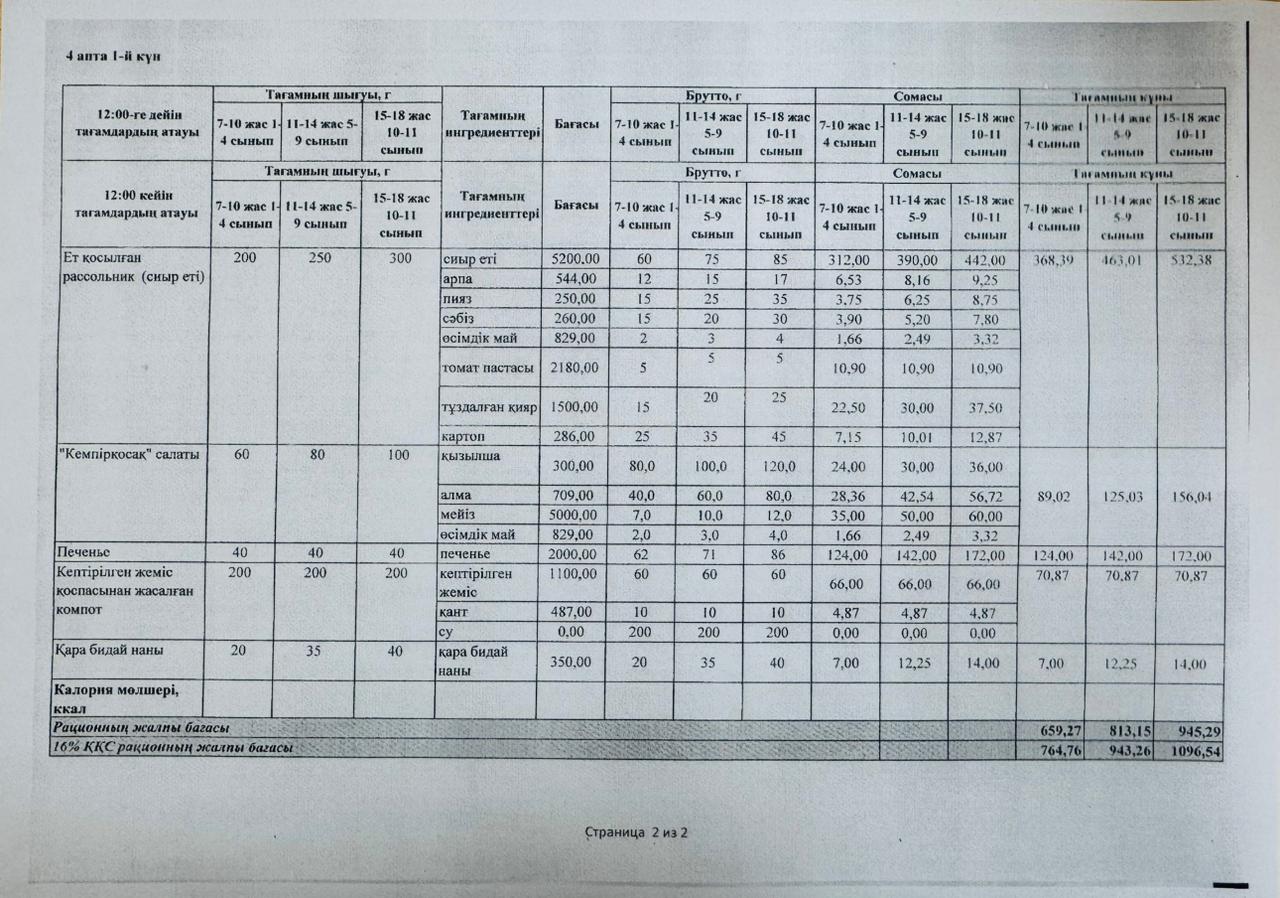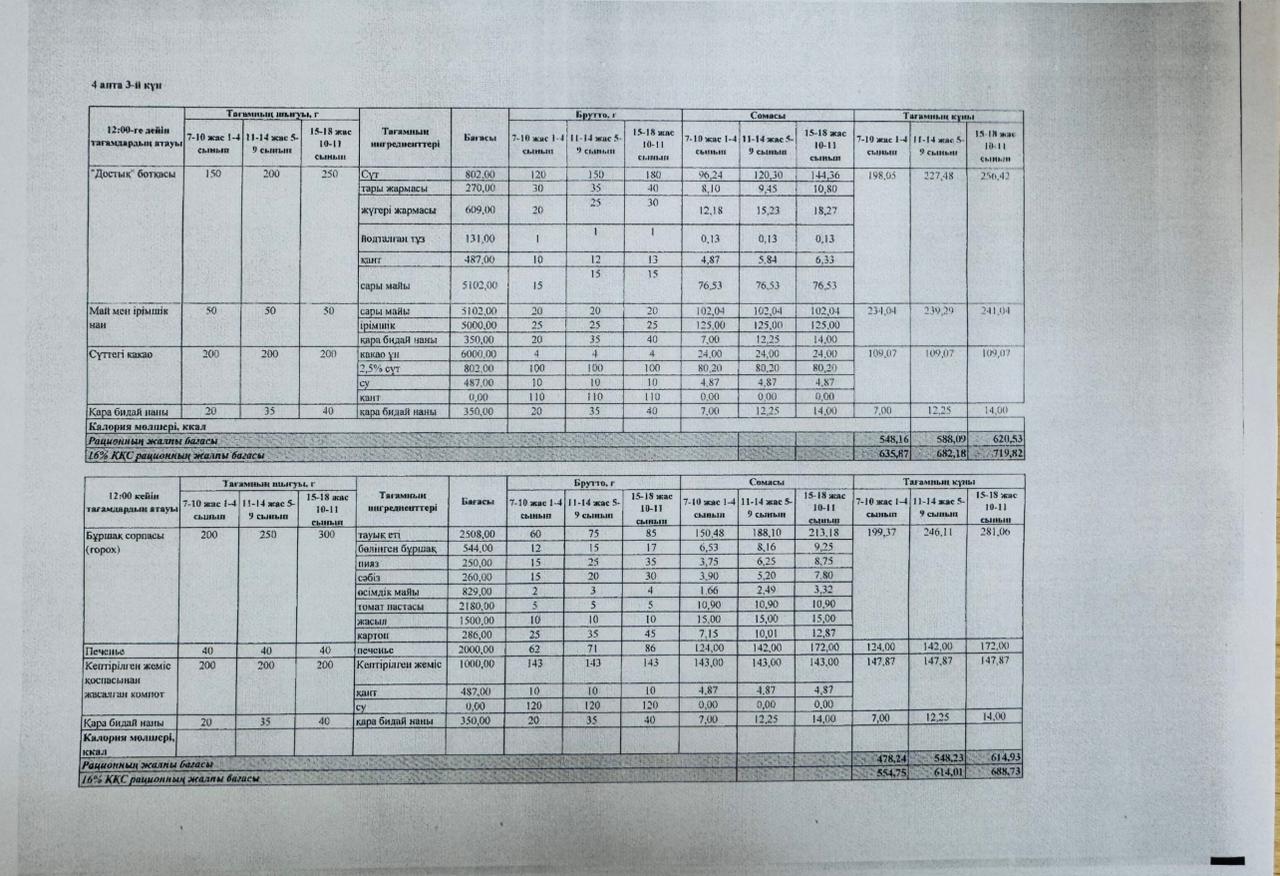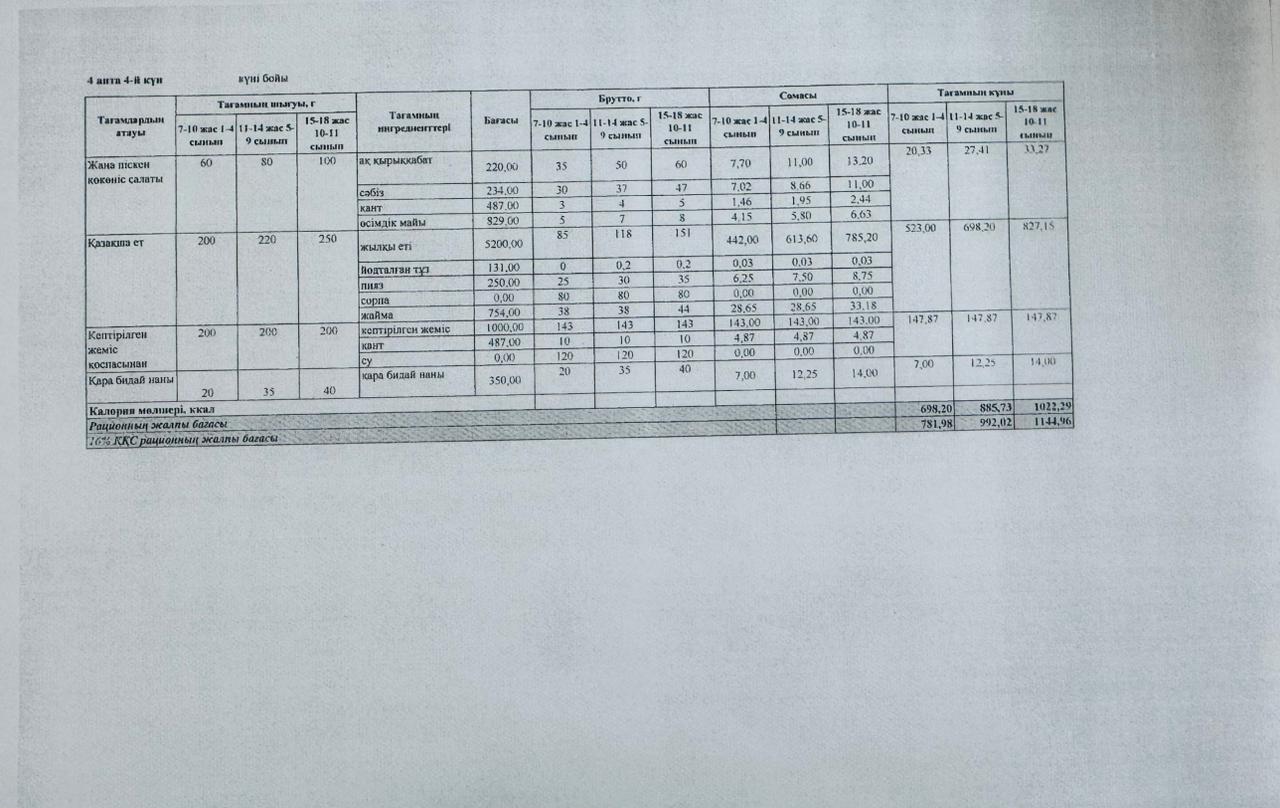 Лицей асханасының төртінші аптасының ас мәзірі